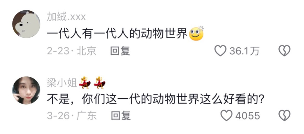 成年人的动物世界就是这样,有点莫名其妙的疯,有点莫名其妙的燃,还有点莫名其妙的搞笑,加在一起却能产生神奇的化学反应。有人因此爱上大自然,有人在这里获得快乐与知识,也有人在动物世界参透人生,这或许正是,“一代人有一代人的动物世界”的真谛。