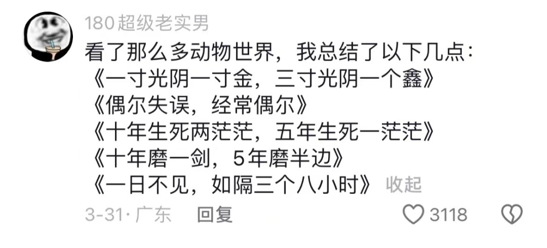其实,在有意思、长知识之外,新一代动物世界的奇妙之处还在于,它时不时会出其不意地戳中当代年轻人的神经,引发强烈的情绪共鸣。毕竟,那些描述动物世界的“废话”,放在成年人类的世界,照样适用。
