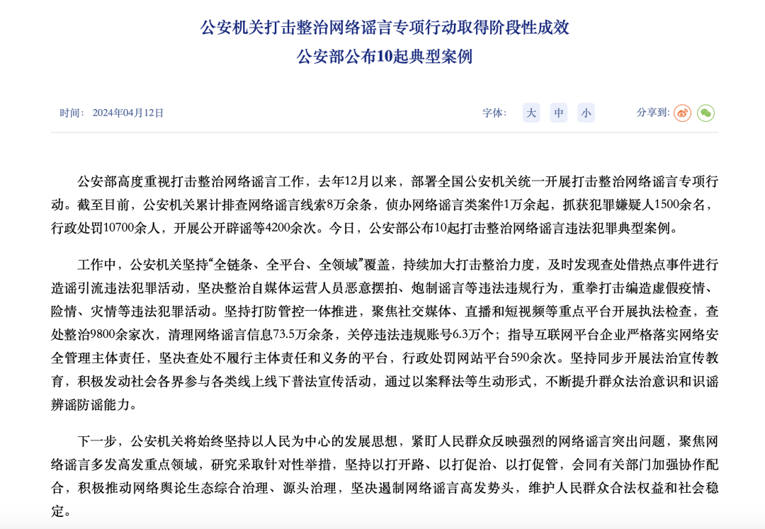 近年来,在互联网技术和产业快速发展的背景下,受“流量经济”刺激,网络谣言的内容广度、传播速度、更新频率、影响范围及社会危害性等显著增强。公安部党委决定将2024年作为打击整治网络谣言专项行动年,部署全国公安机关开展为期一年的专项行动,打防管控一体推进,持续加大全链条、全平台、全领域打击力度。