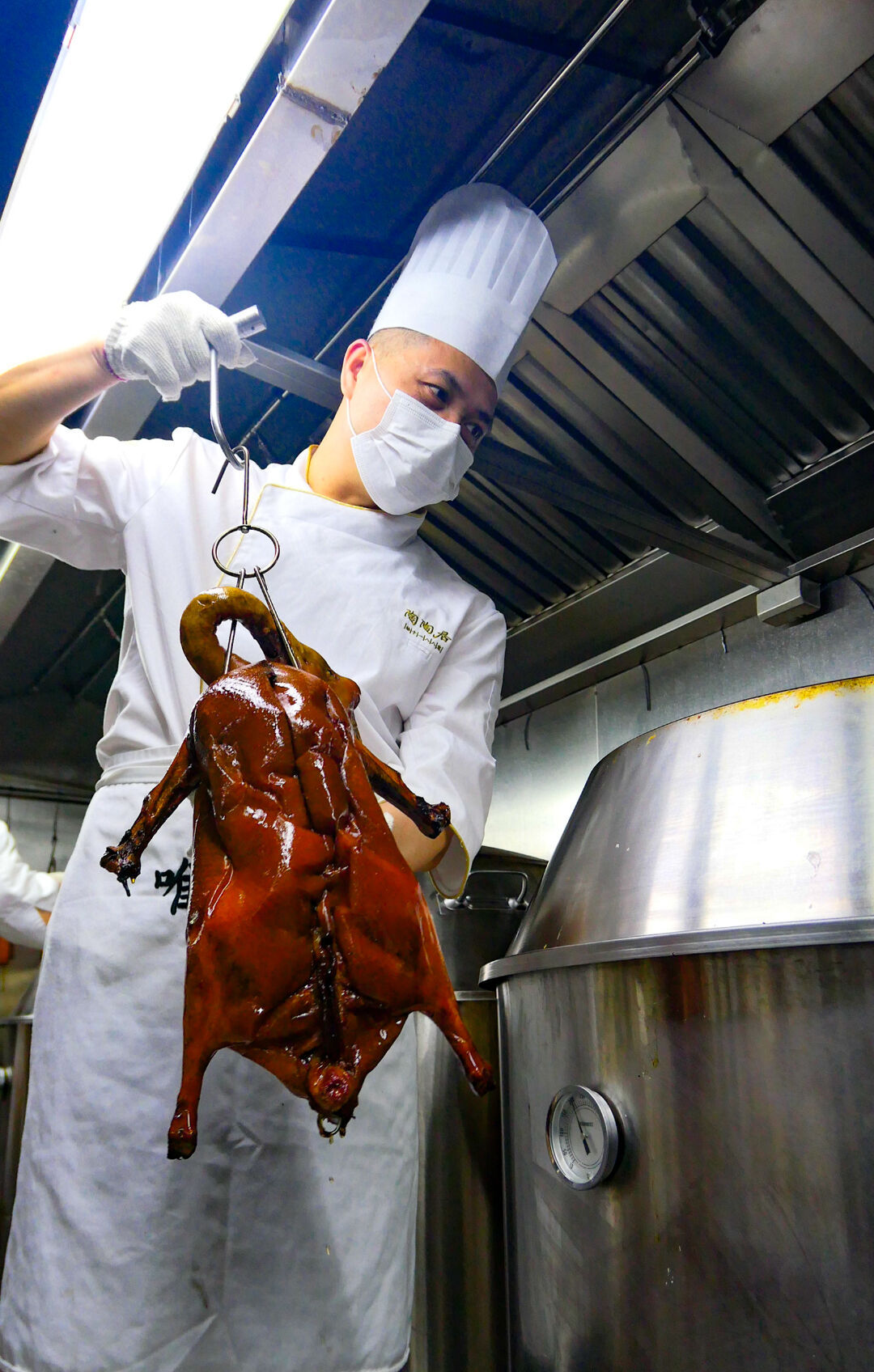陶陶居在肇庆高要有个养殖黑棕鹅的基地,师傅表示,唯有满足净重7.5~8斤的黑棕鹅才达到出品标准。“这个重量的鹅,肉质比较嫩滑,‘不够称’或者‘太重称’都不行。为了方便烧制,每只鹅的重量相差不会超过两三两。”在陶陶居烧味部工作了8年的苏师傅有一套独到的烧鹅经验。