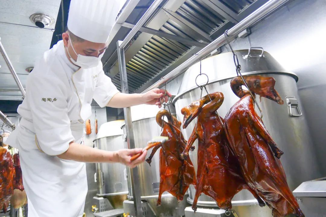创始于清光绪六年(1880年),至今已有144年历史的陶陶居,不仅沿用传统烧鹅配方,而且对酱汁、上皮水、烤制等加工程序进行不断改进。苏师傅表示,陶陶居烧鹅备受食客好评,关键在于对原材料有了更高要求,其中食材的新鲜度最要紧。“鹅在农场宰杀后马上运送过来,到店后师傅要即刻进行腌制、缝针、上皮水等步骤。如果隔夜才处理,鹅肉就会失去鲜嫩的口感。”