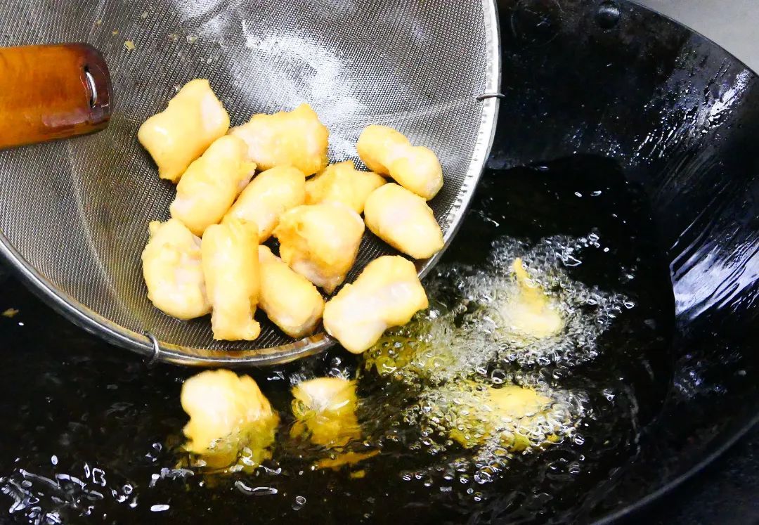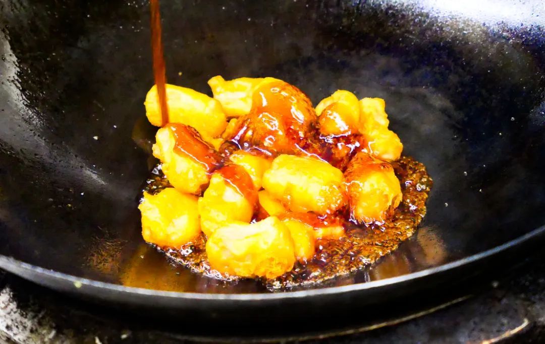 为了减轻油腻感,陶陶居选用猪颈肉替代五花肉,既让咕噜肉富有猪油香气,同时具有爽脆的质感。同样地,脆浆的厚薄,也是影响咕噜肉好吃与否的要素。“按比例将蛋清、脆浆粉、调和油和水将脆浆调成可以拉丝的状态为最佳。”师傅表示,将猪颈肉用盐、味粉和生粉捞入底味后,裹上脆浆即可下锅,炸至表皮呈金黄色。为咕噜肉披上色泽鲜明外衣的,是用白醋、茄汁和酸梅汁调成的酸甜汁,赋予它酸而不呛、甜而不腻的味道。