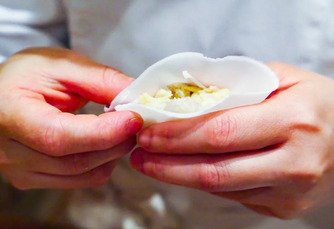 “红里藏鲜”得益于以鲜虾为原料做成的百花馅。据悉,以前的老师傅拌虾饺馅会用2成熟拆虾搭配8成生拆虾。这是因为虾红素是在虾壳上,虾焯熟后再剥壳,虾肉的颜色才会更红艳,蒸出来的虾饺呈嫣红色。为了提升鲜味,陶陶居会在每只虾饺里包入3只青虾仁,而馅中还配有鲜笋粒提鲜。