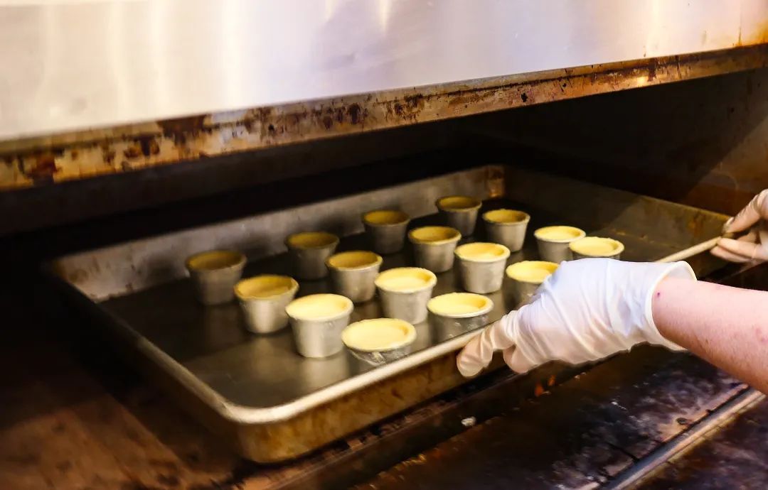 葡挞从送入烤炉到出炉,时间约为15分钟,过程中师傅会根据酥皮的状态及时调整烤箱的温度。小梁一边旋转烤盘,一边说:“转烤盘可以让葡挞均匀受热。如果葡挞面还没烤上色,而酥皮已经略微呈焦黄色,就要把底火温度调低,面火温度保持不变。”一只酥皮香脆蛋芯滑嫩的葡挞,饱含了师傅的用心与细心。