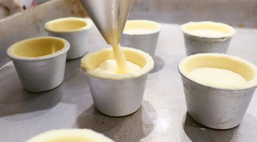只见小梁把顺滑的蛋水挤入一个个如小桶状的葡挞盏中,每只都刚好约7分满。为何不把蛋水放满些呢?“蛋水烤制过程中会略微膨胀,太满容易泻出,影响葡挞皮的口感。”要知道,蛋水制作的关键,在于水和糖的比例。糖若太少,蛋水烤熟后塔面可能会出现裂纹,自然达不到“如亮镜”的效果。若糖太多,则会过于甜腻。小梁说,陶陶居的葡挞蛋水里加了淡奶油,“相比传统蛋水,添加了淡奶油口感会更顺滑,奶香味更充足,而且淡奶油里自带甜味,所以可以减少糖的分量。”