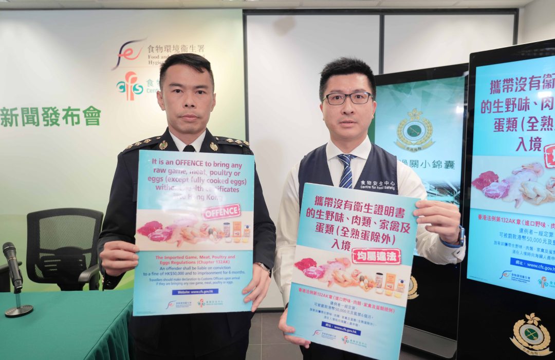 香港海關及香港特區政府食物環境衛生署食物安全中心人員呼籲市民、遊客勿非法進口受規管食物。