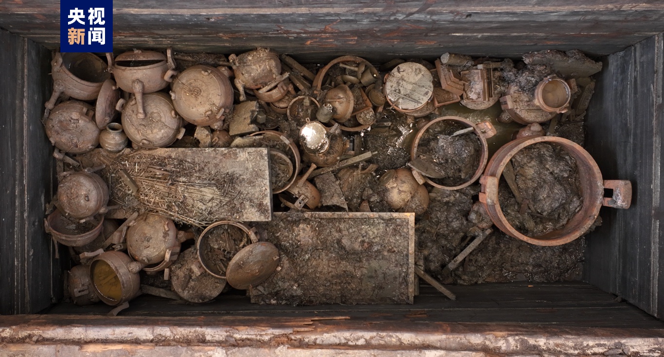 椁室盖板上发现有墨书文字,已发现和采集100多句、近千字,标示盖板的位置与各侧室的功能。已提取漆木器、青铜器等编号文物超过千件,包含青铜礼器、生活用器、漆木器、乐器、俑等珍贵文物。其中漆木器数量、种类都是空前的。东Ⅰ室南端放置的大鼎粗测口径超过88厘米,大于已知最大的李三孤堆出土的楚大鼎(铸客大鼎)。