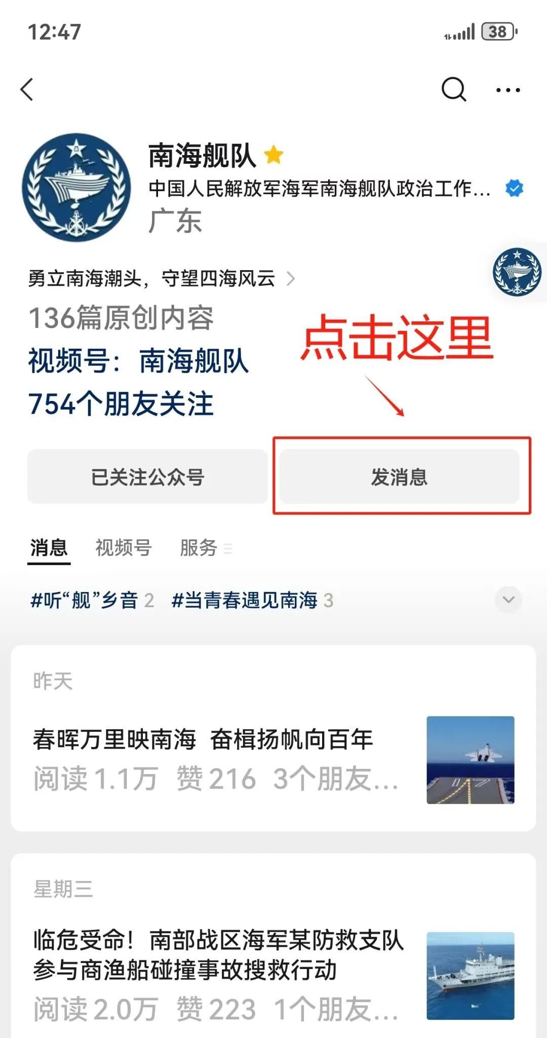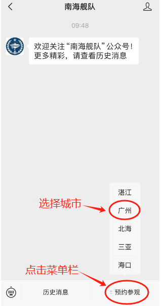进入“南海舰队”微信公众号点击菜单栏“预约参观”,点击想要参加的城市进入预约页面,按提示填报相关信息,待审核通过后,按预约时间入场参观。