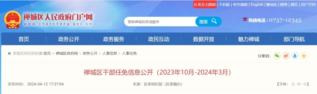 近日,佛山市禅城区人民政府官网发布最新人事任免信息。