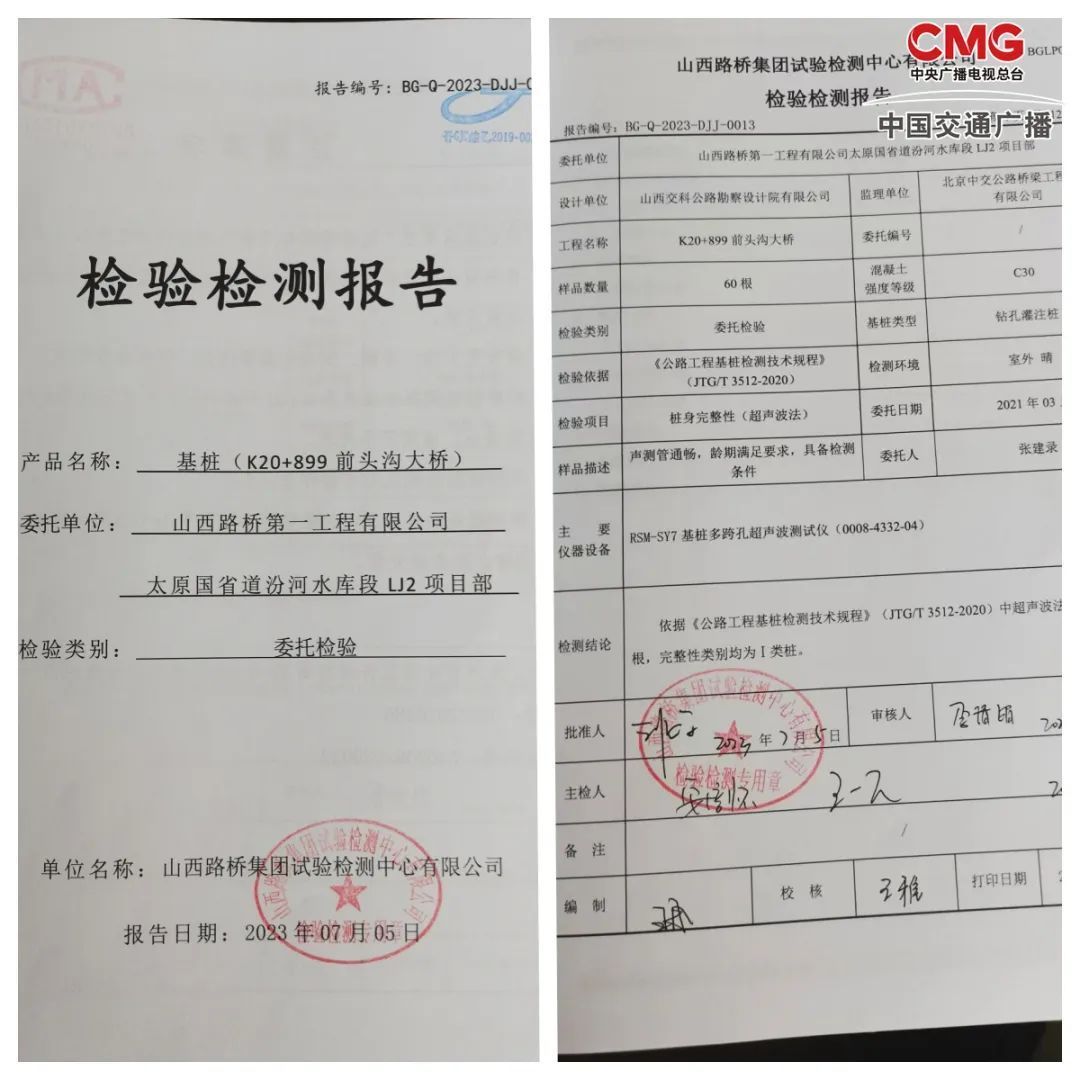 就此,中国交通广播记者专程到山西路桥一公司核实情况。其项目部的负责人冀文俊、张建录告诉记者,朱竹林所反映的情况不属实,并给记者出示了一份前头沟大桥的基桩检验检测报告。