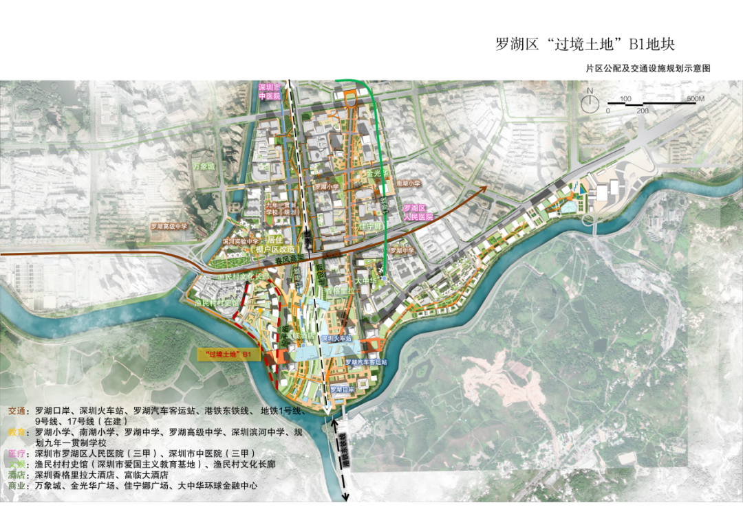 过境土地B1地块地处罗湖深港现代商贸业升级发展区范围内,毗邻罗湖口岸、深圳火车站,用地面积约10公顷,现状为净地,是深港两地共同治理深圳河截弯取直后形成的“过境”土地,承载着深港合作“试验田”的重大使命。