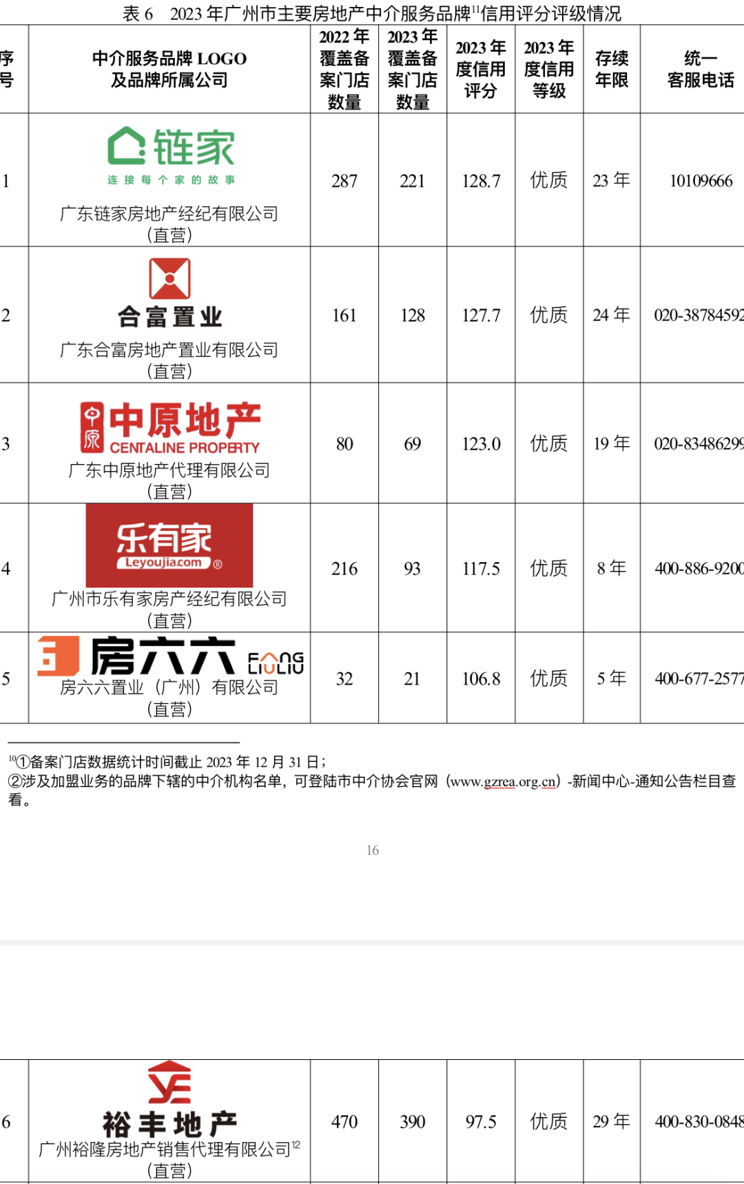 2023年,广州共有备案中介机构3302家,门店数量在20间及以上的14家房地产中介服务品牌中,信用等级为“优质”的有6家,分别是:链家、合富置业、中原地产、乐有家、房六六、裕丰地产。