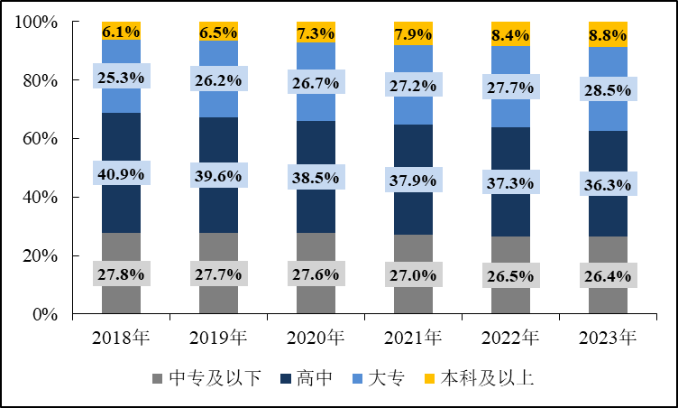 在房地产市场调整期,学历较高、经验丰富的从业人员生存能力较强,从2018年至今,广州记录在职从业人员的学历构成中,拥有大学(指大专及以上)文化程度的从业人员占比在逐渐走高,6年时间中本科及以上学历占比上升2.7个百分点至8.8%;大专学历占比亦逐年走高,增加3.2个百分点至28.5%;相反,高中及以下学历水平的从业人员则有所下降。
