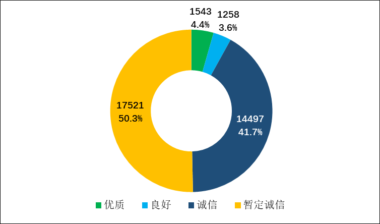 截至2023年12月31日,全市共有34819名记录在职从业人员,较2022年减少2638人。其中信用等级为“优质”的共1543人,“良好”的1258人;信用等级为“诚信”的共计14497人,比例为41.7%;信用等级为“暂定诚信”的有17521人,占比为50.3%。