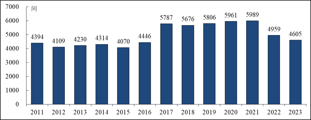 截至2023年末,全市备案门店(包括备案中介机构和分支机构)数为4605家。全市备案门店数近年变化趋势与备案中介机构基本一致:在经历了2017年至2021年的高峰期后,于2022年开始出现较明显下降,2023年同比继续减少,数量与2016年大体相当。