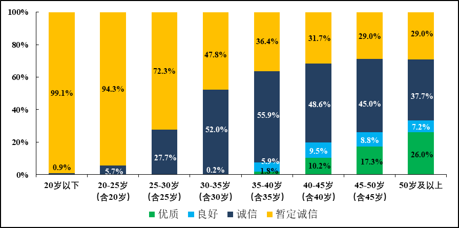 2023年全市记录在职从业人员平均年龄为34.7岁,随着从业人员年龄的增长,信用等级优化的趋势愈加明显。年龄在35岁以下的从业人员中,信用等级为“暂定诚信”或“诚信”的占绝大部分;而35岁以上的从业人员中信用等级为“良好”或“优质”的占比逐渐提升,其中45-50岁(含45岁)、50岁及以上的年龄区间合计占比分别为26.1%和33.2%。