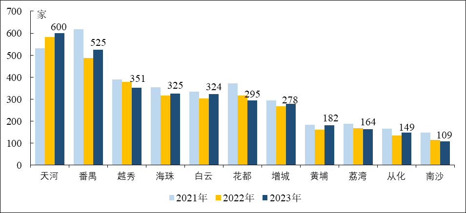 截至2024年2月25日,广州市房地产中介行业已建立信用档案且备案证书有效的中介机构共计3302家,其中天河区备案中介机构数量最多,共有600家,番禺区525家居第二,同比增加37家,越秀区以351家居全市第三,越秀区、花都区、荔湾区及南沙区中介机构数量均呈连续下降趋势。