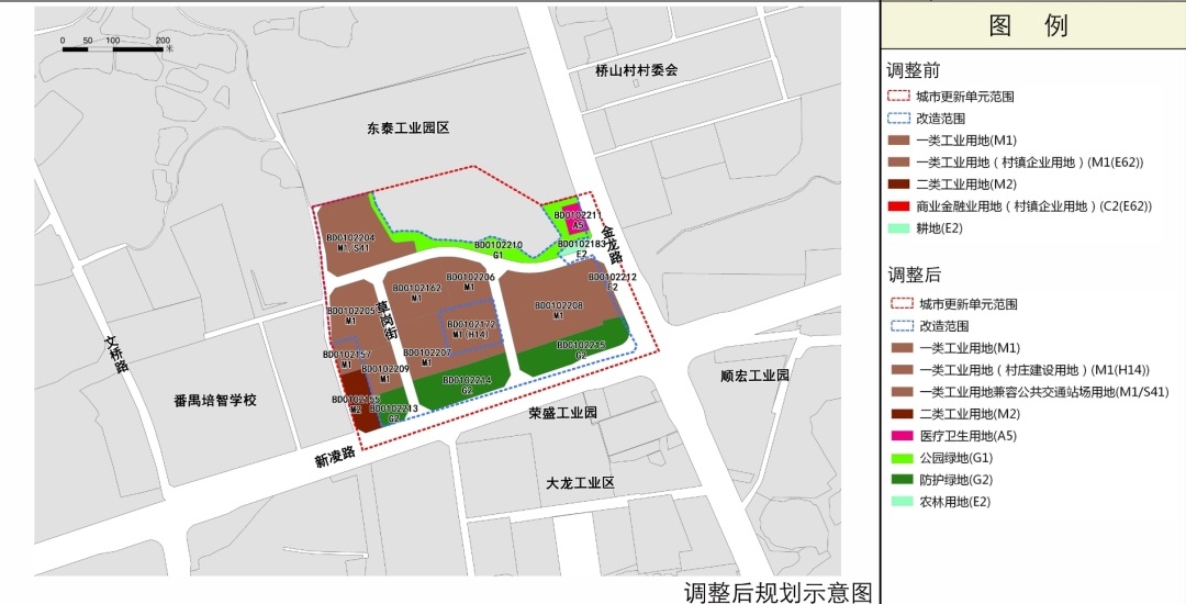 土地利用及建设规模方面,改造范围内用地由二类工业用地、一类工业用地(村镇企业用地)、耕地和商业用地(村镇企业用地)调整为一类工业用地,整体统筹配套设施建设,兼容公共交通站场用地、增设医疗卫生用地。更新单元范围内、改造范围外用地结合规划道路线位对地块边界及用地性质进行调整优化,其余均不作调整,按现行控规执行。改造范围规划总用地面积16.98公顷,规划总计容建筑面积约45.32万平方米。其中一类工业用地7.77公顷,一类工业用地兼容公共交通场站用地1.87公顷,公园绿地1.22公顷,防护绿地3.08公顷,医疗卫生用地0.20公顷,城市道路用地2.84公顷。