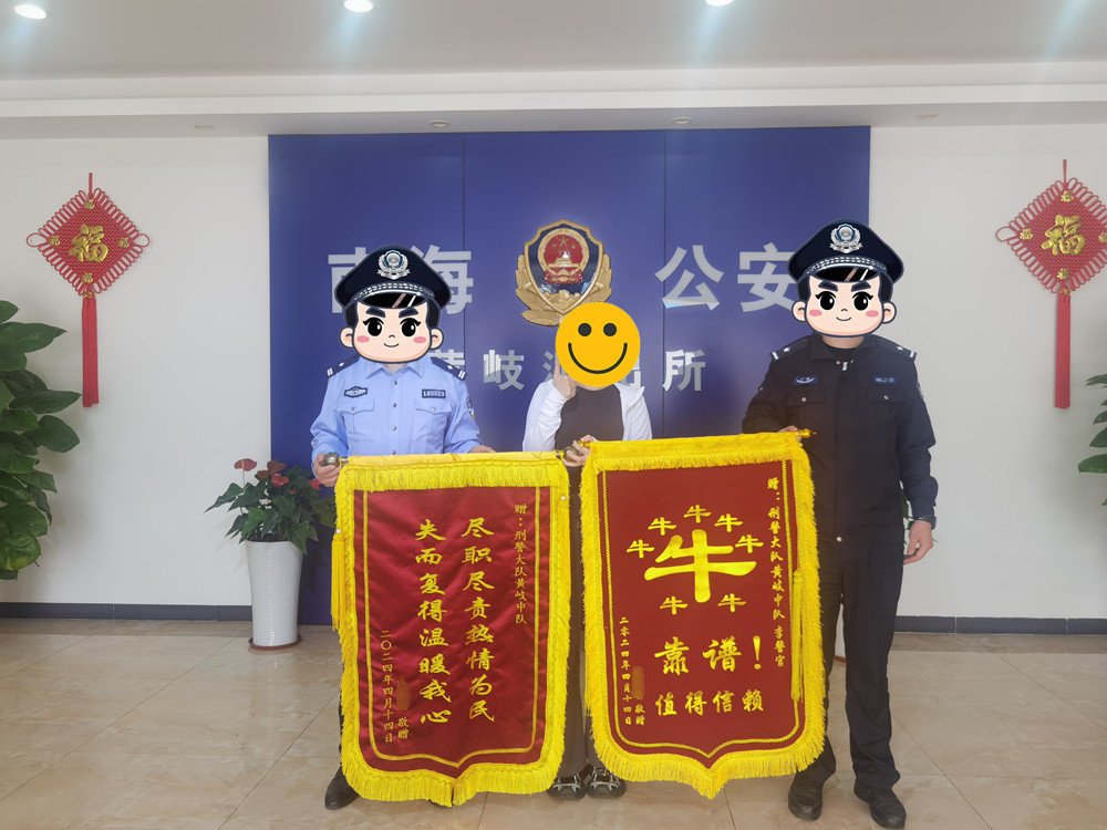 4月14日,收到钱款的周女士怀着激动的心情来到黄岐派出所,向办案民警送上了两面锦旗,打开之后满屏的“牛牛牛牛牛牛牛牛”映入眼帘。周女士夸赞道:“一个牛不足以显示你们的厉害,一面锦旗不足以表达我的感谢,警察同志,你们太靠谱了!”