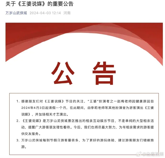 4月3日,开封万岁山武侠城发布公告:“王婆”扮演者之一赵梅老师因健康原因自2024年4月3日起请假一个月,在此期间,由李莉老师等其他扮演者为游客演出《王婆说媒》,并加场相关才艺演出。