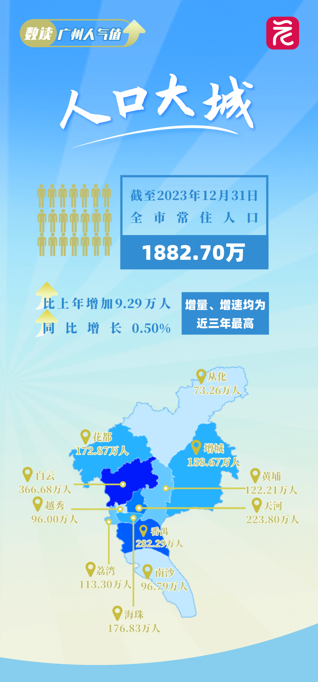 截至2023年12月31日,广州全市常住人口为1882.70万人。