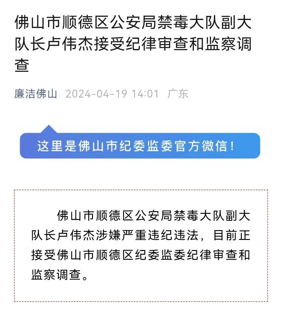 刚刚,佛山市纪委监委官方微信“廉洁佛山”发布了“佛山市顺德区公安局禁毒大队副大队长卢伟杰接受纪律审查和监察调查”的消息。