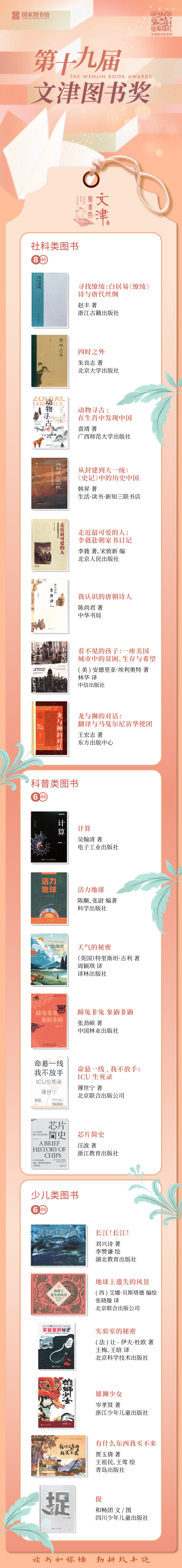 记者获悉,以上第十九届文津图书奖获奖图书,将在4月23日昆明召开的第三届全民阅读大会上整体亮相。