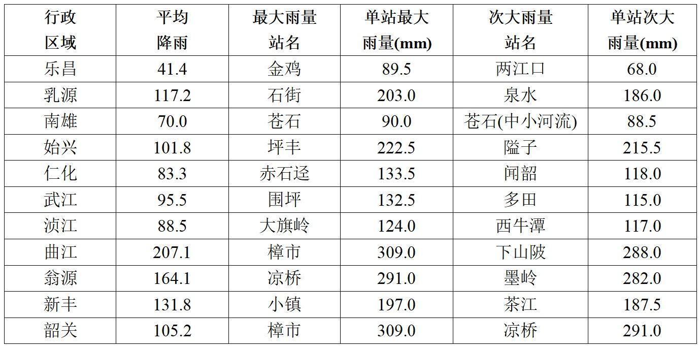 4月19日8时至20日8时,韶关市暴雨到大暴雨,局部地区特大暴雨。韶关平均降雨量为105.2毫米,其中单站最大降雨为韶关市曲江区樟市镇樟市站309.0毫米。