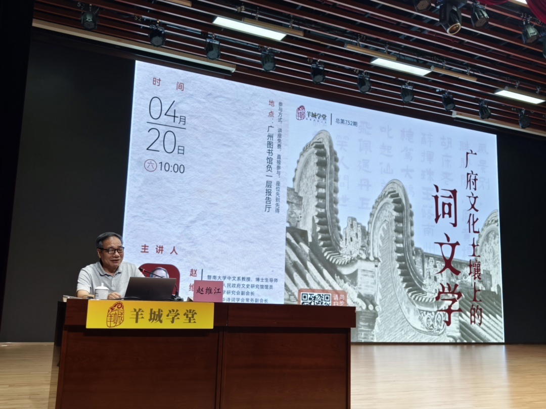 四月读书天,正值广州读书月,各种阅读活动在羊城热烈开展。4月20日,广州图书馆的“羊城学堂”请来暨南大学中文系教授、博士生导师、中国词学研究会副会长的赵维江老师开讲“广府文化土壤上的词文学”,吸引了不少诗词爱好者。
