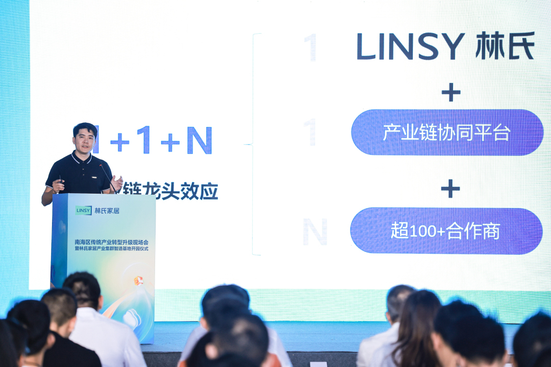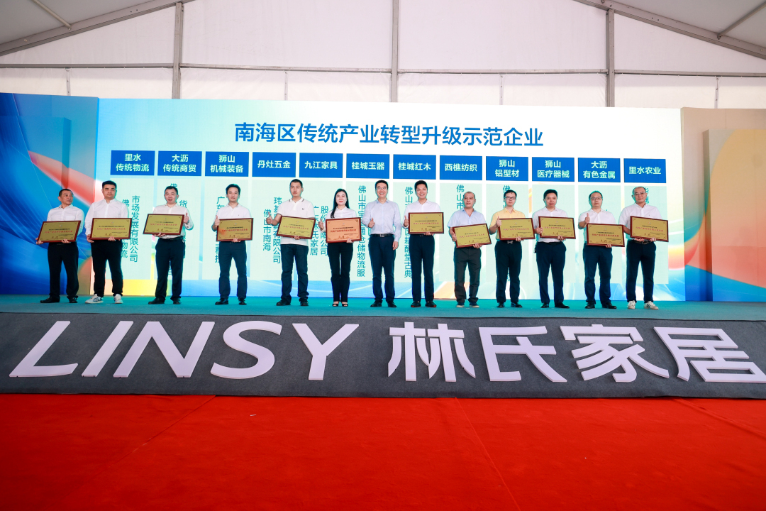 仪式现场,林氏家居被授予“南海区传统产业转型升级示范企业”“智慧家居示范基地”称号。作为发源于南海九江的家居企业,林氏家居产业集群智造基地的启动落地,也是企业引领南海传统产业转型全新赛道,实现数字升级的重要引擎。