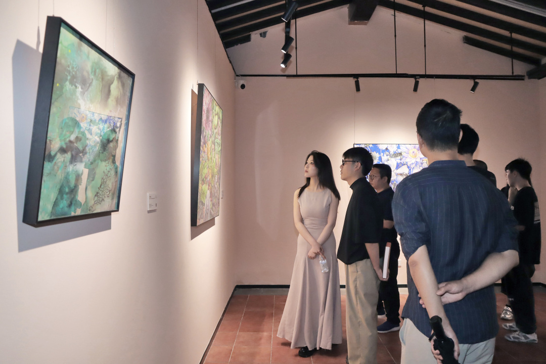 据介绍,此次展览主要展出徐泓鑫水彩作品“生灵默语”和“青”两个系列。“生灵默语”系列用色鲜艳明丽,缤纷多彩,“青”系列则以深沉的色调和独特的技法,触动观者内心深处的共鸣。创作形式上,前者以重构组合的方式让现实自然中鲜有并存的物象跃然纸上,创造出虚幻而绚烂的世界;后者在材质上更倾向于综合材料,水墨、金箔、矿物颜料等轮番上阵,辅以拓印与压膜等多种工艺技法以展现出作品中的神秘与深邃。