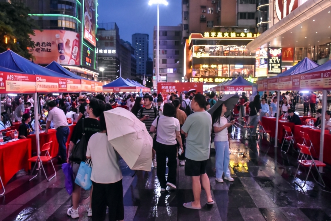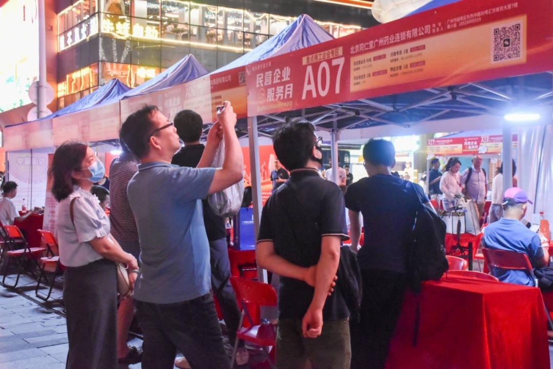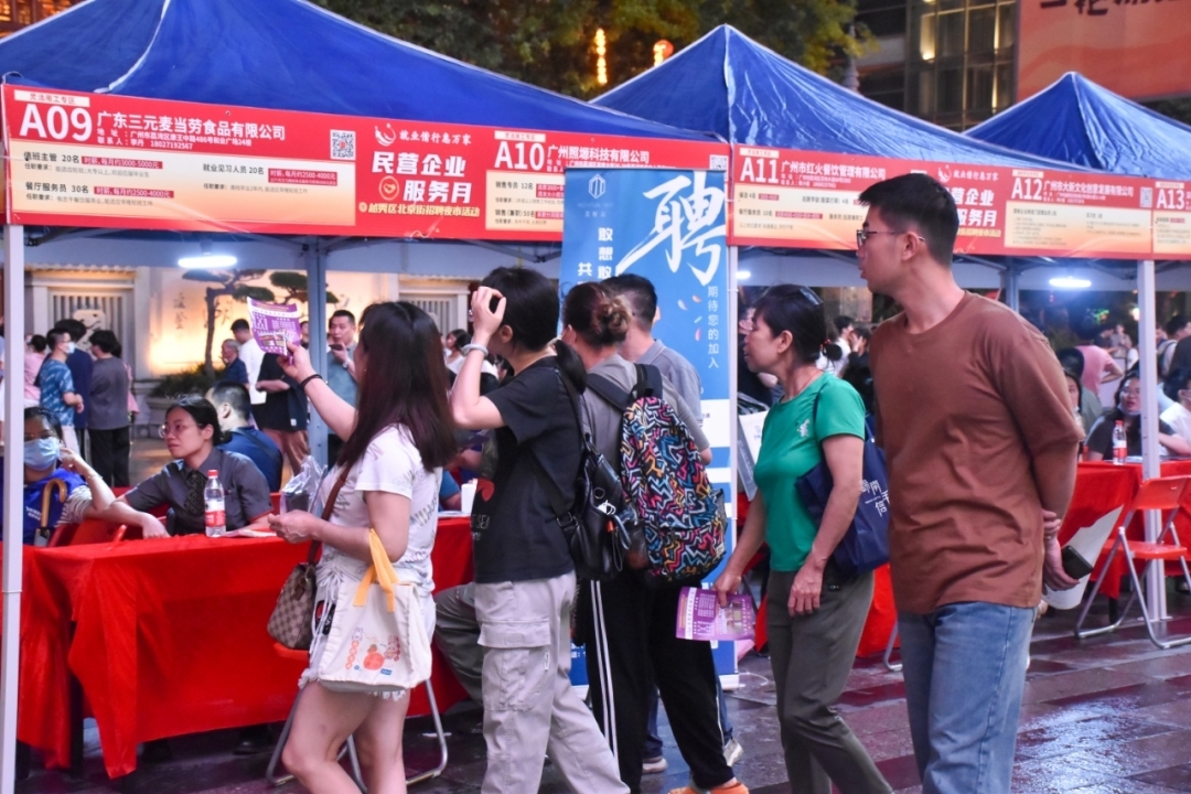 夜幕下,招聘旺。4月19日晚,由广州市越秀区人力资源和社会保障局、越秀区总工会、北京街道办事处联合举办的“民营企业服务月”暨越秀区北京街招聘夜市活动在西湖路广百文化广场“开张”。