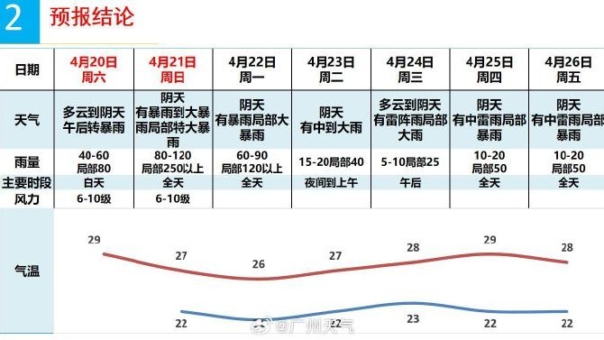 【广州启动防暴雨内涝三级应急响应】市三防总指挥部决定从4月21日06时45分起,启动防暴雨内涝三级应急响应,各单位、各部门请按预案规定做好防御工作。重点做好城乡内涝、山洪、小流域洪水、山体滑坡等灾害的防御。详情>>【强对流天气来袭,广州发布重大天气安全预警提示】4月20日,广州市应急管理局、气象局发布提醒:未来几天,我市降水频繁,特别是21-22日预计将有暴雨到大暴雨局部特大暴雨,并伴有短时强降水、8~10级雷雨大风等强对流天气。详情>>
