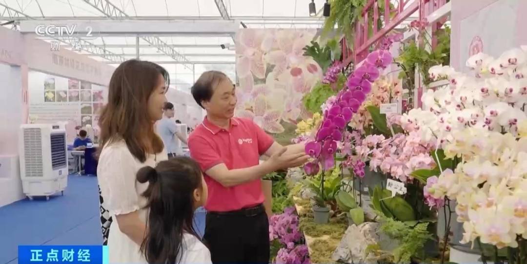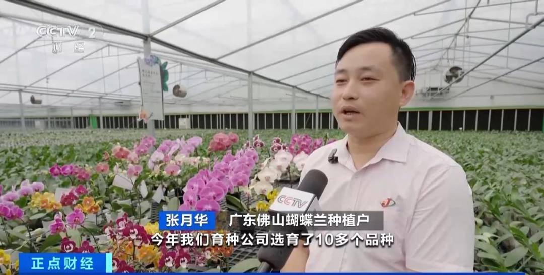 广东佛山蝴蝶兰种植户 张月华:今年,育种公司选育了10多个品种,有一种“黑紫底”加“白舌头唇瓣”的花,色差比较大,对比强烈,很受年轻人的喜欢。今年大概有100万株开花株进入市场,新品种占三成。