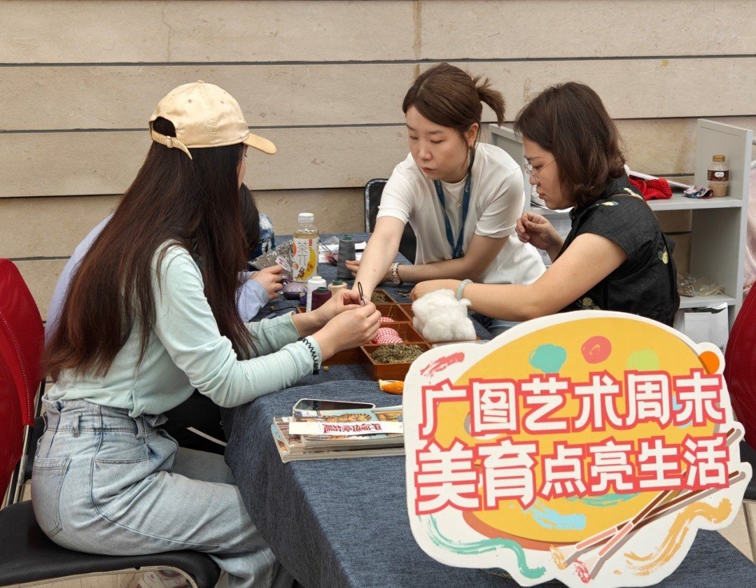 在“艺术周末”体验摊位现场,来自广州市公用事业技师学院的师生以专业志愿者的身份,为读者展示并指导制作各式古风香囊。其中柿子和苹果形状的香囊分别寓意“万事如意”、“岁岁平安”,深受读者欢迎。摊位还设有特色套章,现场吸引了许多读者上前咨询创客空间服务与“艺术周末”系列活动。