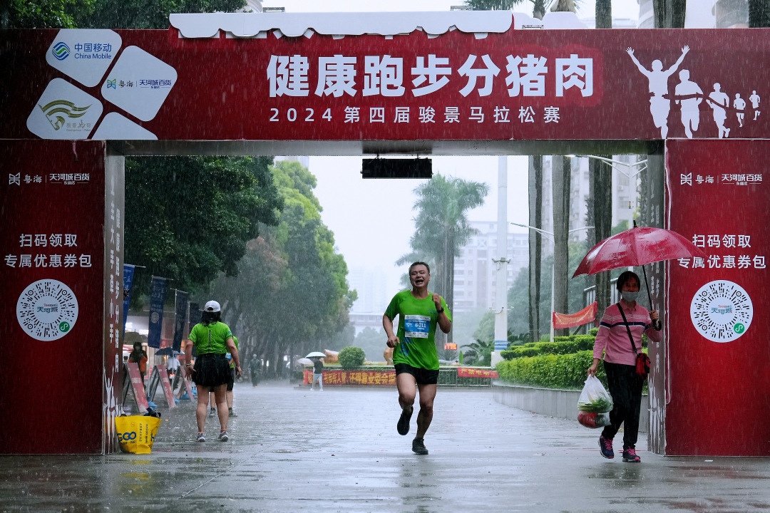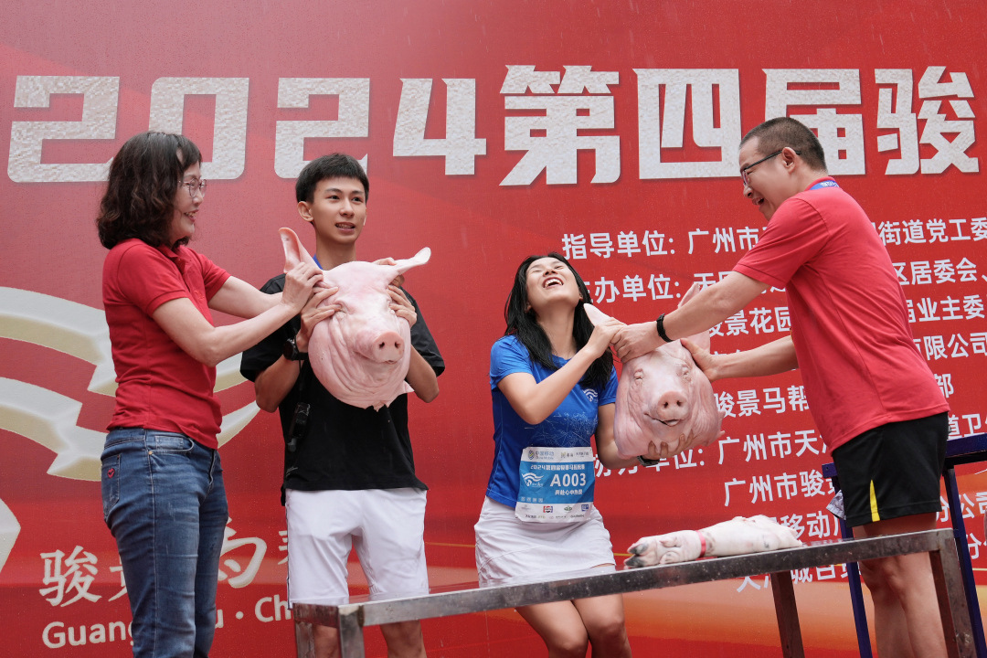 业主大手牵小手,健康跑步分猪肉。4月21日上午,2024第四届骏景马拉松赛在广州市天河区骏景花园开跑,跑步锻炼之余,冠军还可赢得大猪头。赛事由小区自办,没有报名费,只要参加就能领到一块2斤重的猪肉,人人有份,皆大欢喜。奖品猪肉既是餐桌常见的美食,也成为骏景社区“人间烟火气”最形象的代表。
