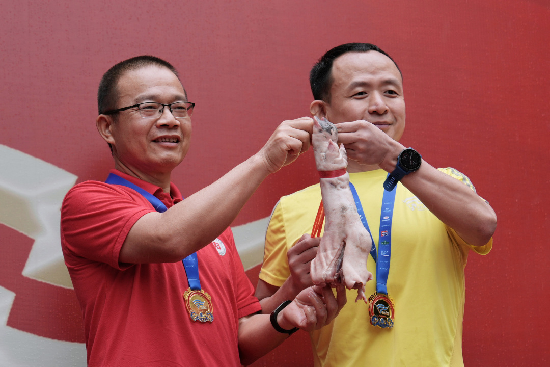经过激烈角逐,庆仔和燕子分别以1小时30分钟和1小时45分钟的成绩获得男女半程马拉松组冠军,按照比赛奖励办法,两人分别获得猪头一只。第二名选手获得猪前腿一只,第三名获得猪后腿一只,而10点后第一个冲线的还可以获得“特别奖”——猪尾巴一根。