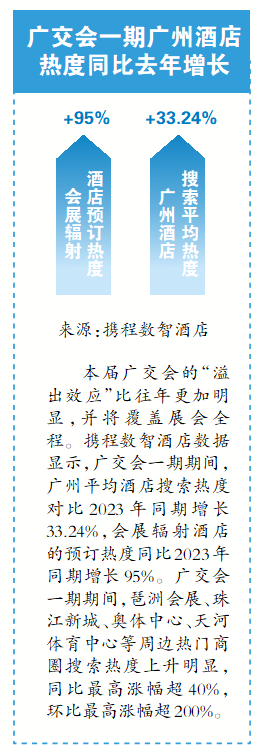 截至目前,综合广交会期间酒店商旅情况可见,共建“一带一路”国家和地区的外商显著增加,为酒店行业带来新流量。公寓民宿等特色住宿产品受到商务客青睐,也蕴藏着发展新机遇。另外,酒店接驳交通、美食套餐、旅游配套等衍生服务也备受好评,成为酒店在会展期的消费新增长点。