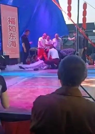 记者注意到,4月19日22:41,重庆当地一名网友发布祝寿演出现场的视频显示,一名身着演出服的女演员倒在台上,一名女子按压其胸部为其做心肺复苏,台上台下有多人围观,现场挂有“90大寿 福如东海”的祝福标牌。
