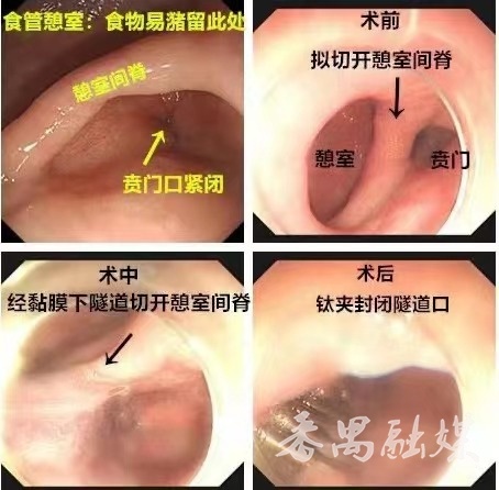 近几年,兴姨均只能进食半流食物、进食米饭需兑汤水才能咽下。去年5月,兴姨因腹部不适、吞咽不畅到番禺区何贤纪念医院就诊。经过胃肠镜检查,胃镜见食管中段扩张,见食物潴留,贲门紧闭,内镜通过有阻力,食管下段见一巨大憩室。结合胃肠镜所见,病因明确。该院消化内科王念林主任团队跟患者及家属充分告知病情,经患者及家属同意手术,术后逐步恢复饮食,2天后患者出院,吞咽顺畅。出院1周返院复诊,能进食米饭、固体食物。