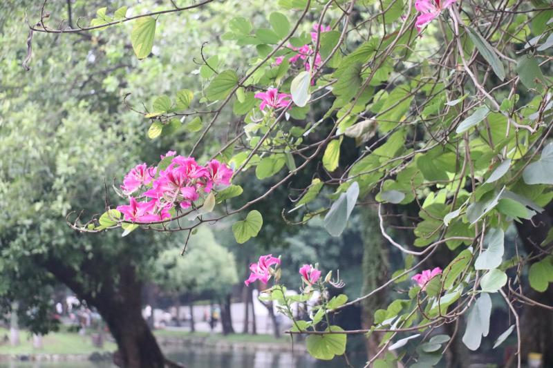 越秀公园东秀湖塑木栈道种植了紫荆花。信息时报记者 佘铄嘉 摄