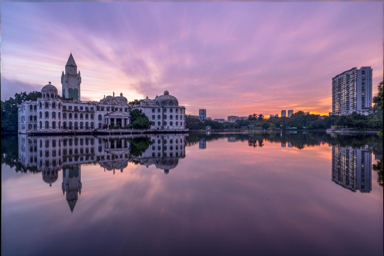 在越秀区流花路,有一颗镶嵌在城市中央的绿色明珠——流花湖公园,它被誉为“岭南盆景之家”,是一座充满魅力的综合性公园。古时,流花湖为天然湖泊,称为兰湖或芝兰湖。对大多数市民来说,流花湖公园最特别的标志是那座矗立在湖面中央的建筑,因白色外观被称为“白宫”。澄净的湖面上倒映着这座欧式风格建筑,湖天一色,诗情画意。