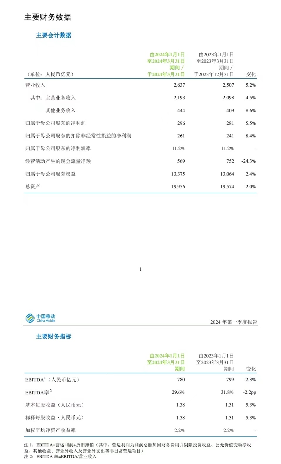 2024年首季度,本公司归属于母公司股东的净利润为人民币296亿元,同比增长5.5%,归属于母公司股东的净利润率为 11.2%;EBITDA为人民币 780亿元,同比下降 2.3%;EBITDA占主营业务收入比为35.6%。