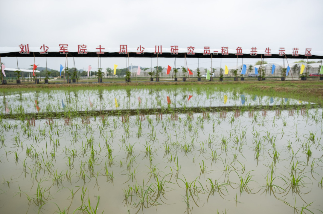 在人和园的“刘少军院士周少川研究员—稻鱼共生示范基地”里,一片片水稻秧苗绿意盎然,红色、黑色的鱼儿成群结队在秧苗间畅游。据介绍,在约50亩的稻鱼共生示范基地内,种植着优质水稻品种美香占2号,第一期投放5000至10000斤优质鱼类,主要是改良红鲫及2024年度重点推广水产养殖品种的合方鲫2号。