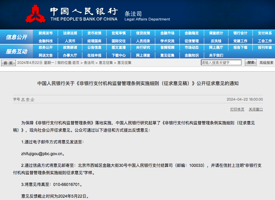 4月22日,中国人民银行发布关于《非银行支付机构监督管理条例实施细则(征求意见稿)》(以下简称《实施细则》)公开征求意见的通知,意见反馈截止时间为2024年5月22日。