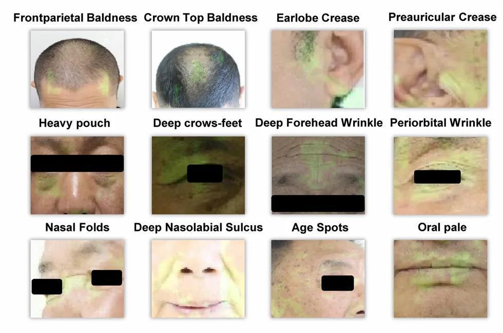 这项研究纳入6000多例择期接受冠脉造影或冠脉CT血管成像检查的患者。研究者发现:额秃(发际线后移)、头顶秃、耳垂折痕、耳前折痕、眼袋深、鱼尾纹深、额头皱纹深、眼眶周围有皱纹、鼻沟、鼻唇沟(法令纹)深、老年斑、口唇苍白等头面部特征,被算法认为可能与冠心病存在较显著关联。