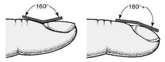 杵状指一般呈双手双脚对称性发作,指甲从指端伸出时所呈的角称为甲上角,正常人甲上角≤160°,杵状指时此角≥180°,且末端指节软组织呈球状,形如鼓槌。