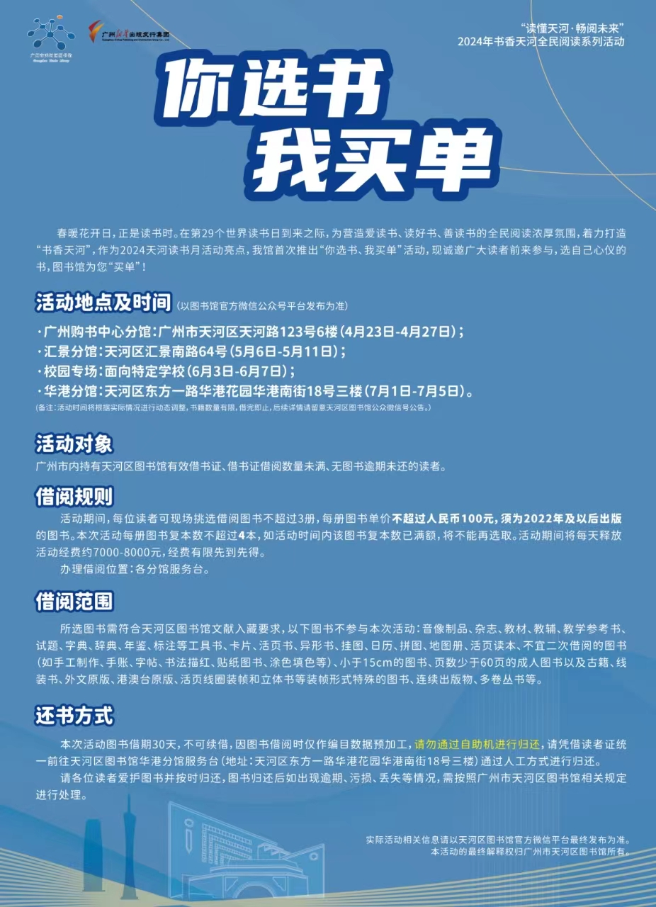 同日,首场“你选书、我买单”阅读惠民活动在天河区图书馆广购分馆启动,将图书馆新书采购权交给读者,图书馆将把读者选取的图书将纳入图书馆藏书,让读者共同参与图书馆馆藏建设。活动旨在打破读者与图书之间的传递壁垒,促进图书馆服务与读者需求的有效对接。