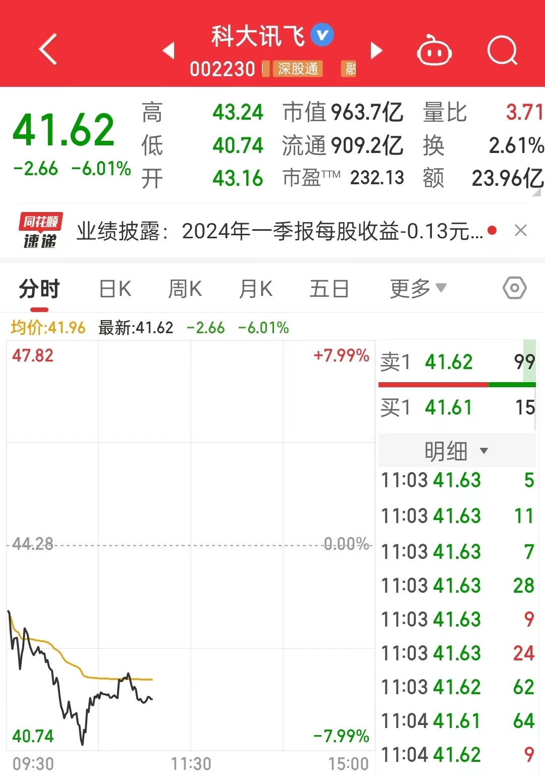 4月23日,科大讯飞盘中下跌,截至发稿,下跌6.01%至41.62元/股。