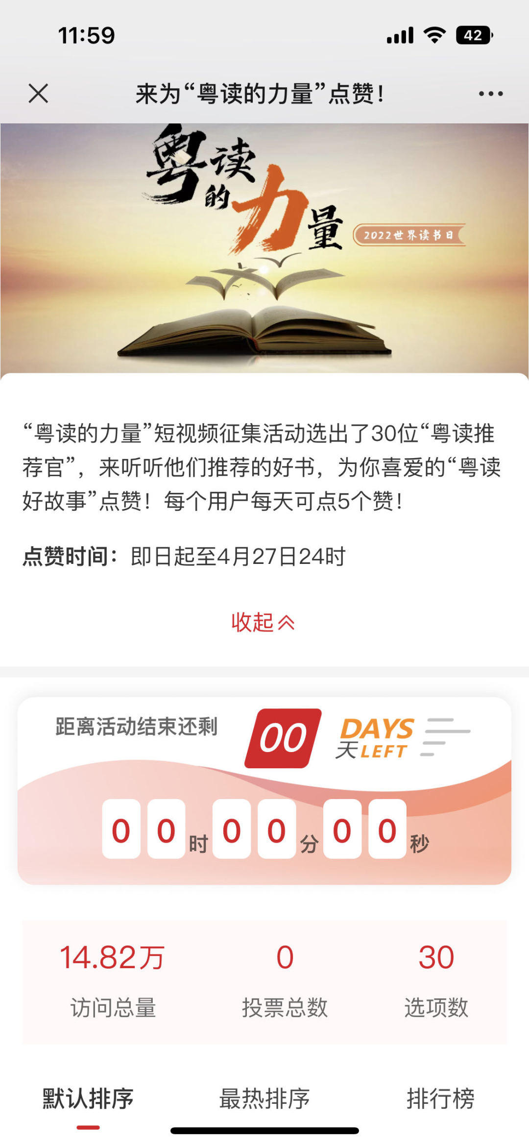 在2022年“世界读书日”,“粤读的力量”发起短视频征集大赛,面向广州市幼儿园、中小学、大专院校在读学生,参与者自主拍摄视频,挑选一本书,朗读片段,并说说喜欢这本书的理由。活动得到各级各类学校大力支持,收到作品数千份,经过专家评审、网络点赞环节,评选出“最佳粤读推荐官”“人气粤读推荐官”“优秀粤读推荐官”等奖项,网络点赞数接近15万。